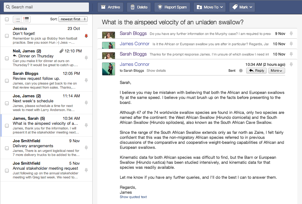 As background, be aware that I don’t think the email protocols (SMTP, POP3, IMAP) cut it any more. So I’m not splitting my email up by rating apps separately from service. I think the two are integrated together. This is because the user experience is better - setup is simpler, and unfortunately basic features like search, spam and filtering have to have a proprietary interface as the standards aren’t good enough. I’d love better protocols to be adopted on a wide scale, but realistically they’re not yet.