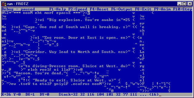 To run ZBefunge you need to get a Z machine interpreter from the IF Archive. I use Frotz, which is available from the Frotz home page. ZBefunge follows the Befunge 93 standard.